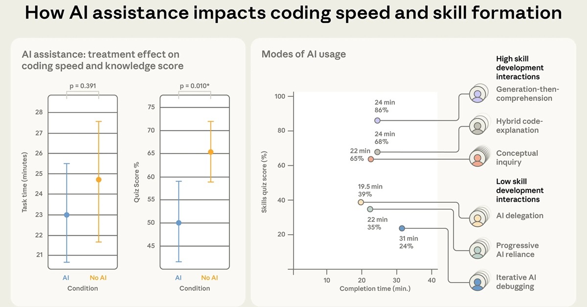 Anthropicは2026年1月29日(米国時間)、AI(人工知能)アシスタントがコーディングスキルの形成に与える影響について調査した研究論文について解説した。52人のソフトウェアエンジニアを対象とした比較試験の結果、コーディングにAIアシスタントを使用すると、新しいスキルの習得度が有意に低下する可能性があることが...