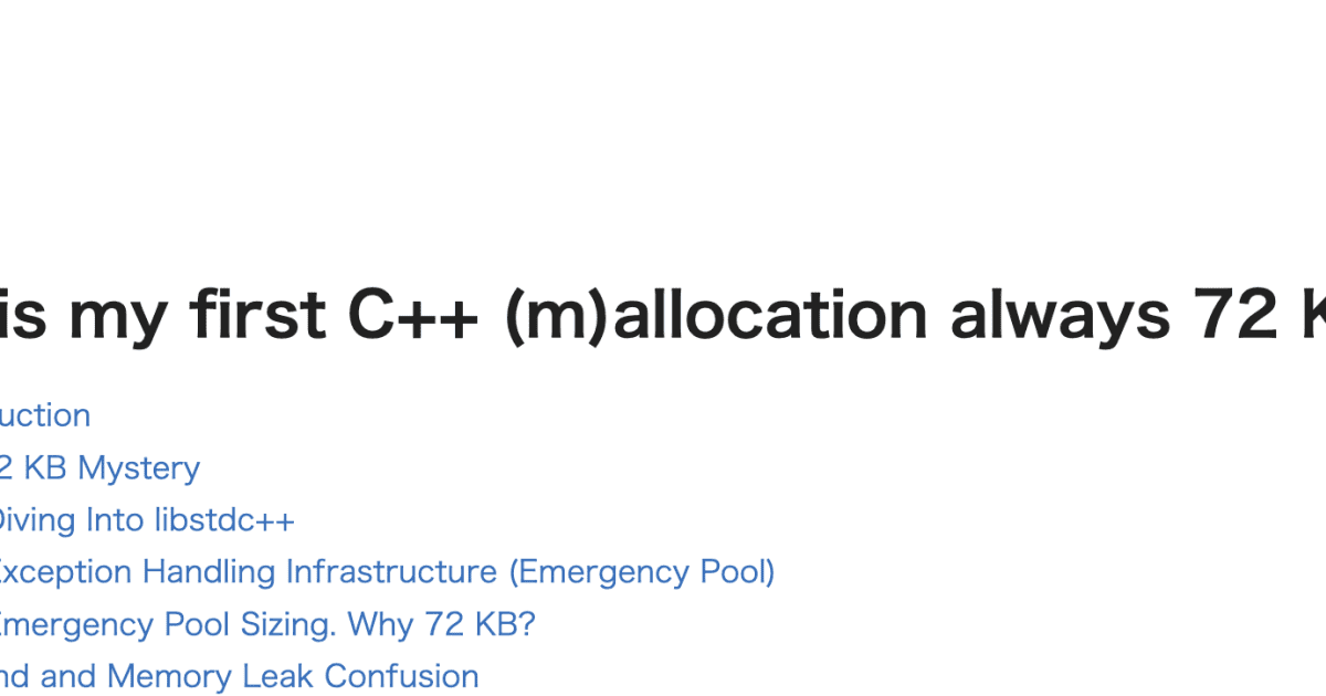 3月2日、Joel Siks氏が「Why is my first C++ (m)allocation always 72 KB?」と題したブログ記事を公開し、話題を呼んでいる。この記事では、著者の特定の開発環境において、C++プログラムの実行直後に必ず発生していた「72 KB」というメモリ割り当ての要因について詳しく紹介されている。