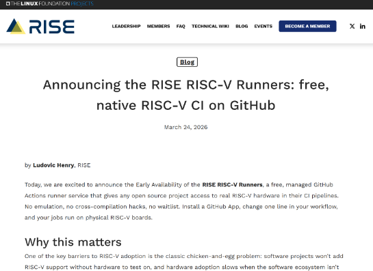RISC-VプロセッサによるGitHub Actionsランナーを無料提供、オープンソースプロジェクトに。RISC-V普及促進団体「RISE」が発表 オープンかつ無料で使えるプロセッサの命令セットである「RISC-V」(リスクファイブ)のソフトウェアエコシステム発展を推進する団体「RISE」(RISC-V Software Ecosystem)が、オープンソー...